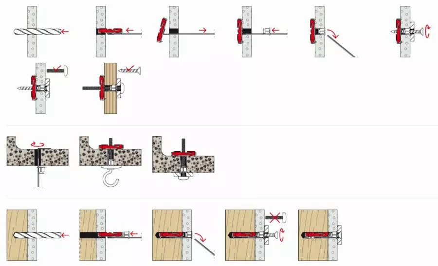 - Perçage standard de petit diamètre et la petite taille de la cheville à bascule (39 mm) simplifient l’installation, même dans les cavités étroites et isolées