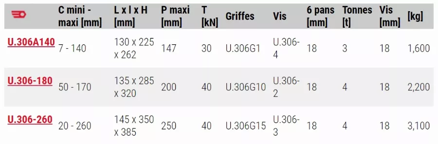 Transformation possible en extracteur à prise intérieure avec les griffes Réf U.306G2 + vis Réf U.306-4 ou griffes Réf U.306G20 + vis Réf U.306-2.