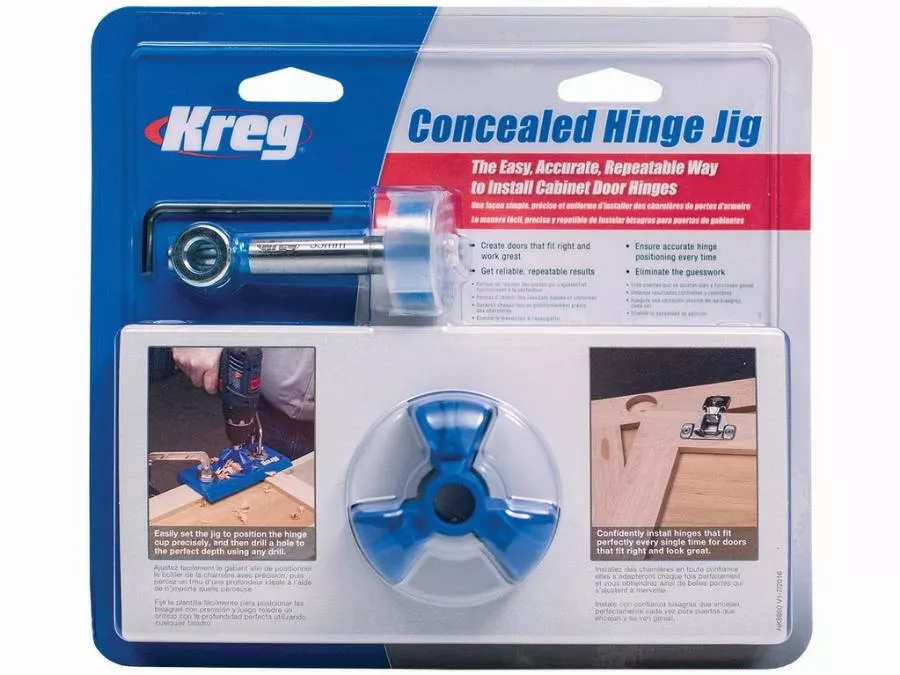 - Les charnières dissimulées sont idéales pour le montage des portes d’armoires car elles restent hors de vue, elles sont réglables et fonctionnent très bien. Leur montage, cependant, nécessite de percer un grand trou à une position et à une profondeur très spécifiques. Le gabarit de charnière dissimulée Kreg simplifie le perçage de ces trous et vous permet de le faire avec rien de plus qu’une perceuse et le foret à pointe en carbure fourni avec le gabarit.