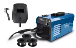 - L’ensemble comprend des accessoires de soudage MIG (torche de 2 m, câble de masse de 1,2 m avec pince, pointe de contact de 0,9 mm, rouleau d’entraînement de 0,8/0,9 mm, 3 bobines de fil autoblindées de 0,25 kg de 0,9 mm).