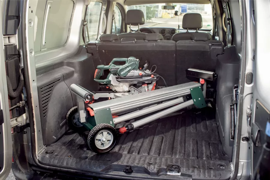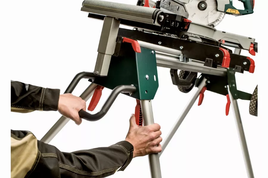 - Socle pour scie à onglets léger et robuste avec fonction Trolley pour l’utilisation mobile avec même avec la scie montée